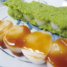 そば粉を練りこんだ餡をそぼろ状に伸しじっくりと炊きあげた大納言羊羹を流し筒状に巻き上げた棹物です。