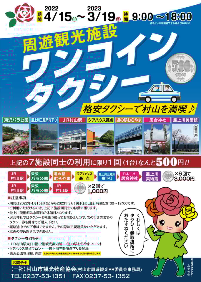 ・JR村山駅東口1階、2階観光案内所・道の駅むらやまフロント・クアハウス碁点フロント ・最上川三難所舟下り乗船場・東沢公園管理棟、売店 ※6月のバラまつり開催期間以外は16時までの取り扱いとなります